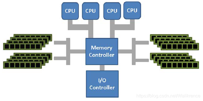 在NUMA架构出现前,CPU欢快的朝着频率越来越高的方向发展(纵向发展)。受到物理极限的挑战,又转为核数越来越多的方向发展(横向发展)。在一开始,内存控制器还在北桥中,所有CPU对内存的访问都要通过北桥来完成。此时所有CPU访问内存都是“一致的”,如下图所示: