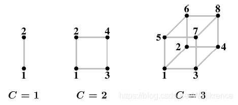 超立方体可以作为一种有效的拓扑来描述NUMA系统,它将系统中的节点数限制在2^C内,C是每个节点拥有的邻居节点数,如下图所示