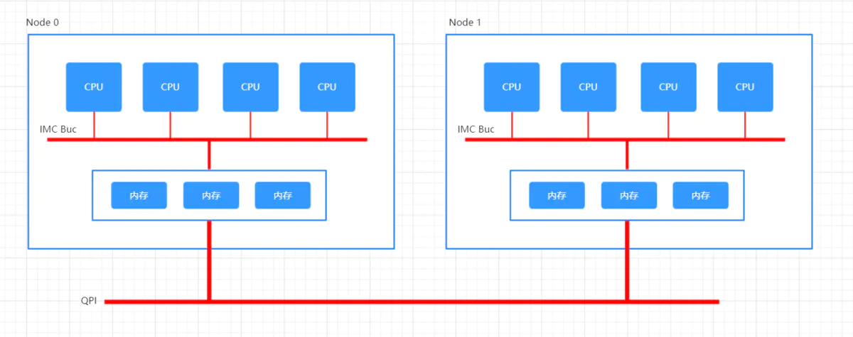 在 Node 内部,架构类似SMP,使用IMC Bus进行不同核心间的通信;不同的 Node间通过QPI(Quick Path Interconnect)进行通信,如下图所示: