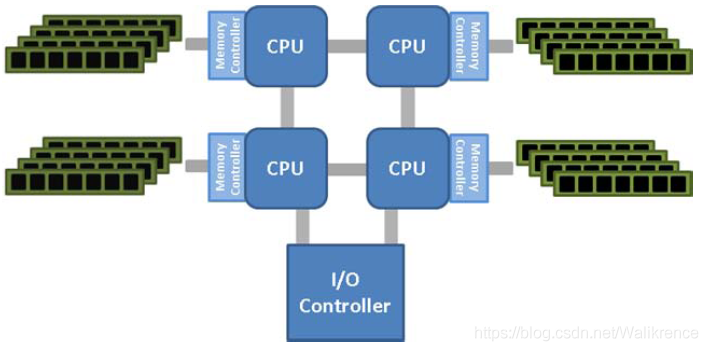 通过“NUMA的产生背景”,让我们了解到了之前内存访问架构原则,与此相对的就是NUMA,NUMA 全称 Non-Uniform Memory Access,译为“非一致性内存访问”。这种构架下,不同的内存器件和CPU核心从属不同的Node,每个 Node 都有自己的集成内存控制器(IMC,Integrated Memory Controller)。