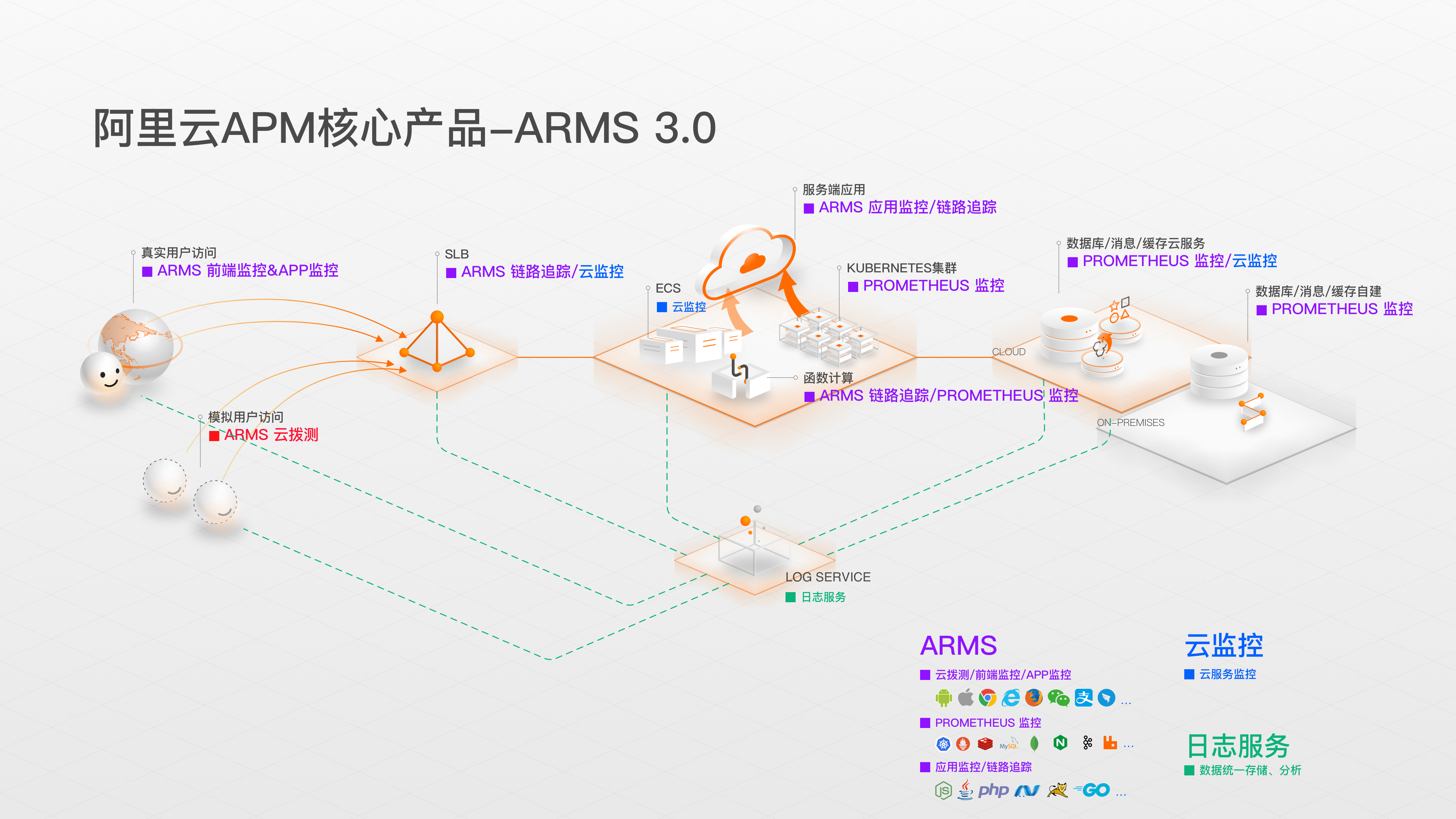 2017年,阿里将内部锤炼多年的监控工具对外,应用实时监控服务 ARMS 正式商业化。作为云原生一体化可观测性平台,ARMS 提供全栈式的性能监控和端到端的全链路追踪诊断能力,同时,结合阿里云日志服务(SLS)的日志数据分析能力以及云监控丰富的云服务与基础设施监控能力,用户可以轻松完成用户体验、应用、云服务、容器的一站式监控。