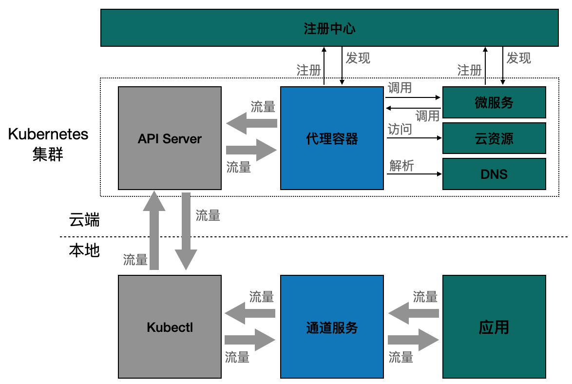 基于此特性,端云互联3.0插件在应用启动时,调用kubectl临时创建一个代理容器。通过结合API Server和临时代理容器进行打通,本地应用可访问云端服务和其他资源。整体链路如下所示: