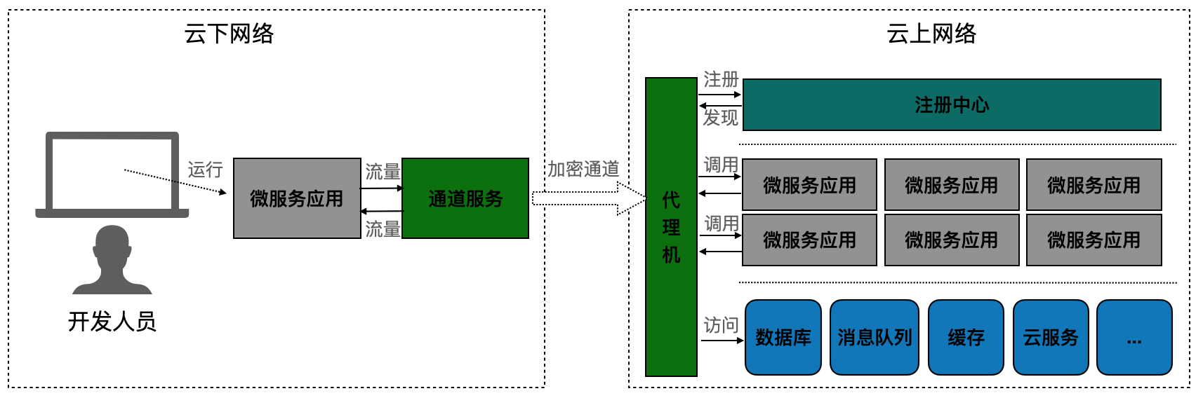 但事情并不是一帆风顺的。应用上云已是历史大潮不可阻挡,但随之而来开发者很快就体会到上云的另一面:由云上和云下网络不通所带来的开发体验割裂感。在上云之前,开发者可以在本地完成代码开发、测试、联调等开发流程闭环;而上云之后,数据库、缓存、消息队列和其他微服务应用都部署在云上的虚拟网络之中,我们再无法在本地完成开发流程。