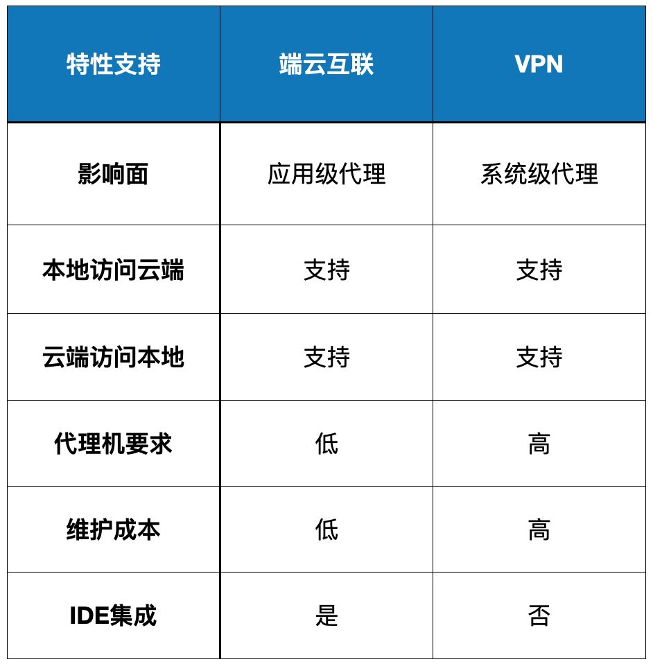 从架构上来看,端云互联跟VPN有点类似,都分为服务端和客户端。但实际上,两者有很大的差异,下图进行了对比总结: