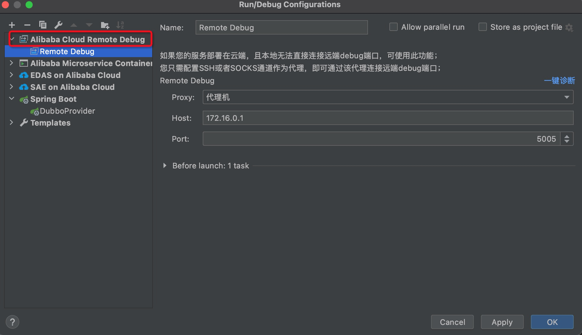 在使用上,你只需配置Alibaba Cloud Remote Debug,配置内容跟IDE自带的远程调试配置基本相同,但支持使用代理进行连接,如下所示:
