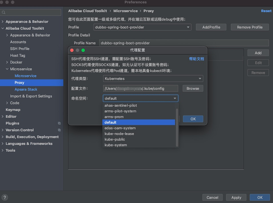 而在插件配置上也非常简单,你只需在插件中设置kubeconfig配置文件和选择Kubernetes命名空间: