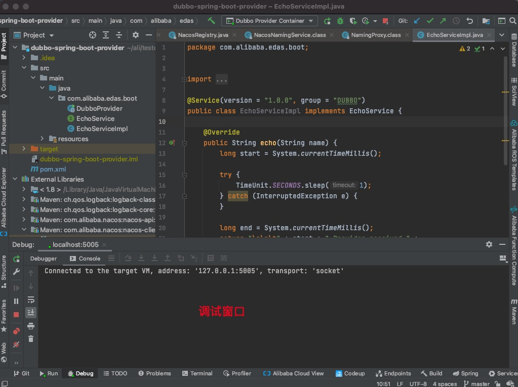由图可见,插件会将容器中应用的日志输出打印在IDE窗口中,日志中的“Listening for transport dt_socket at address: 5005”表示容器中的Java应用已打开调试端口。点击Attach debugger,IDE将会连接到容器中Java应用的调试端口,接下来便可进行代码调试,如下所示:
