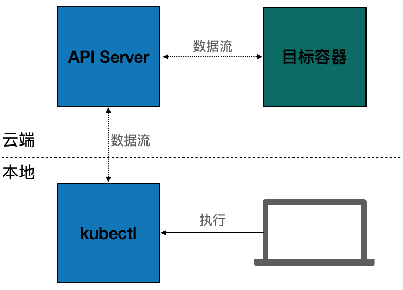 在面向Kubernetes的开发中,我们可以通过kubectl命令和kubeconfig配置文件来跟API Server进行通信,并访问集群中的容器。API Server会对请求进行身份认证、鉴权和加密处理。如果开放API Server的公网访问,那么我们在本地通过kubectl执行交互式命令时,此时API Server将充当中间代理角色,如下所示: