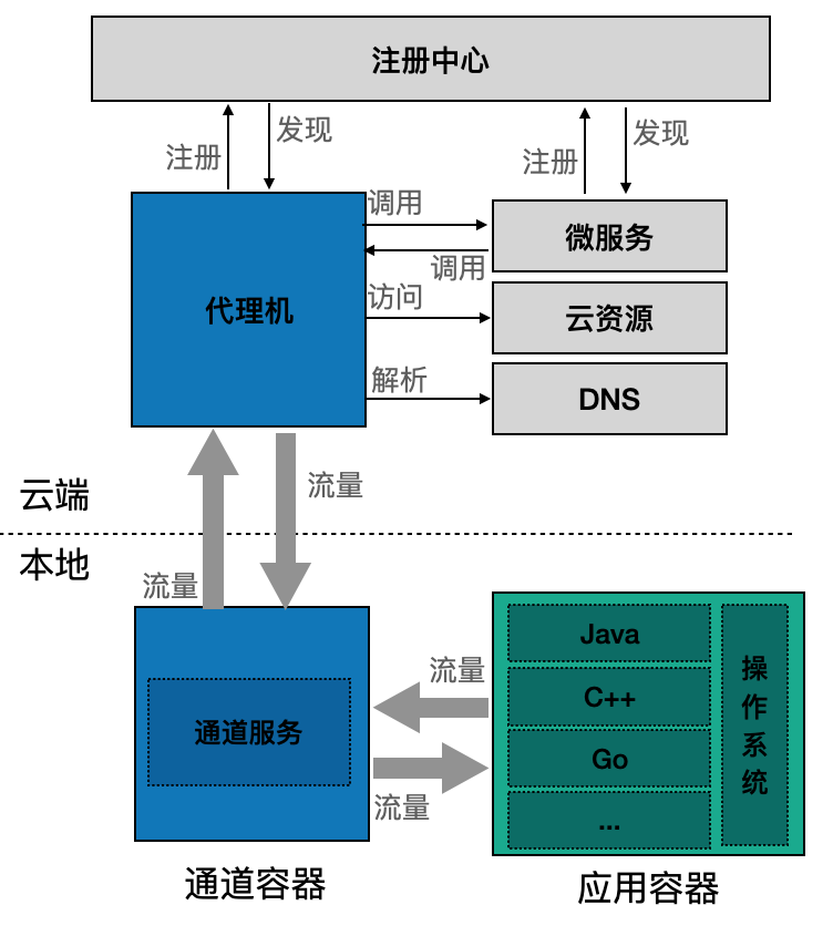 在此模式下,微服务应用和通道服务都使用容器来运行,整体交互如下: