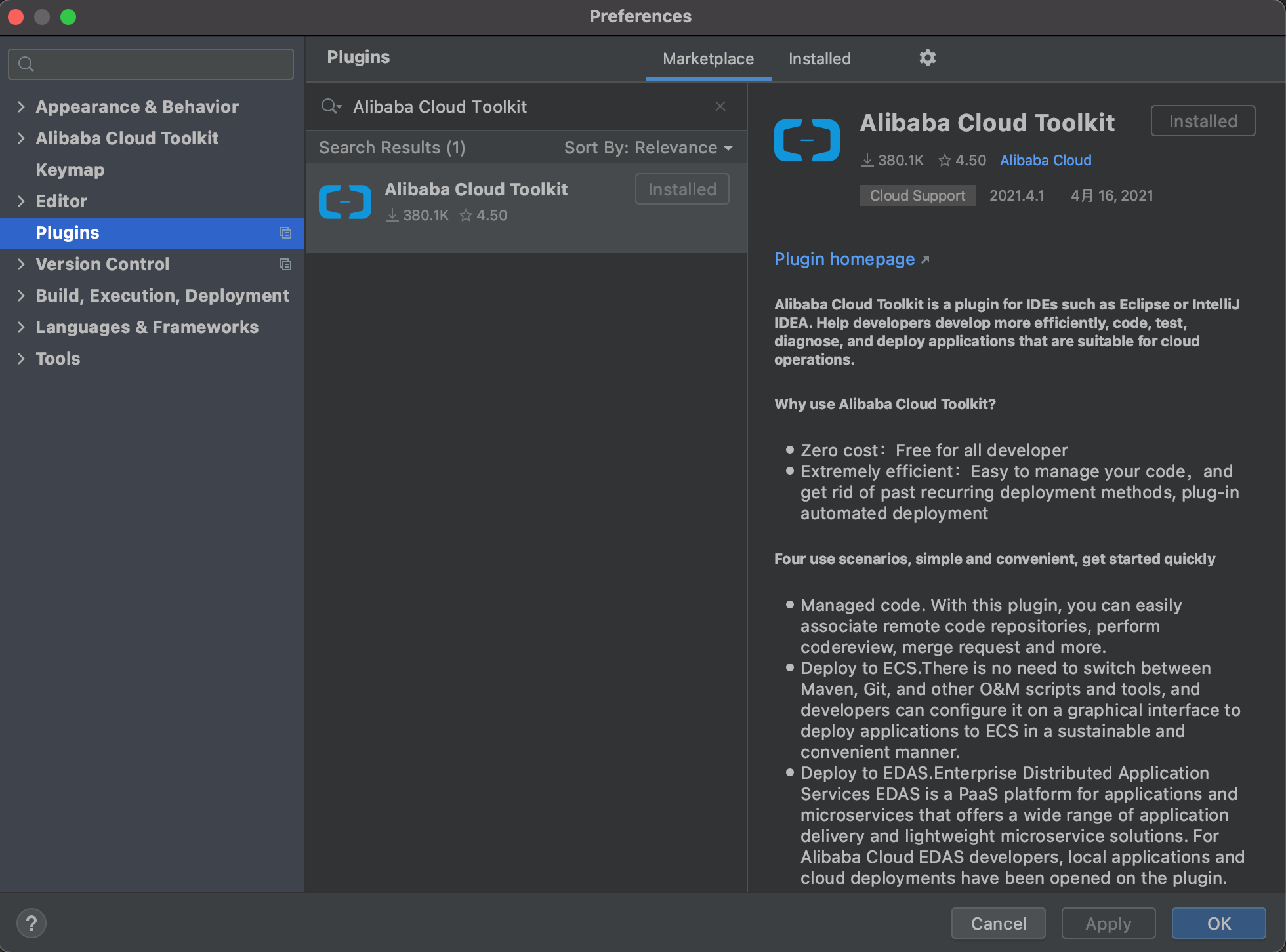 端云互联功能集成在Alibaba Cloud Toolkit(简称ACT)这个上云工具产品中,并支持Intellij IDEA和Eclipse两款IDE。你只需在插件市场中搜索“Alibaba Cloud Toolkit”进行安装即可,例如在Intellij IDEA中搜索如下: