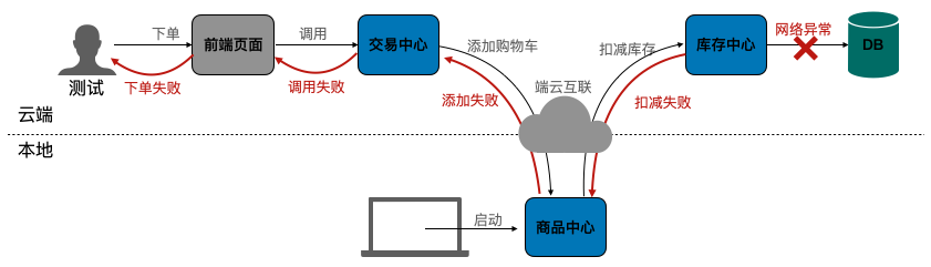 比如,当前环境中有交易中心、商品中心和库存中心三个服务,你正在和测试同学验证新版本特性。测试同学在页面测试下单流程时,发现下单失败,如下所示: