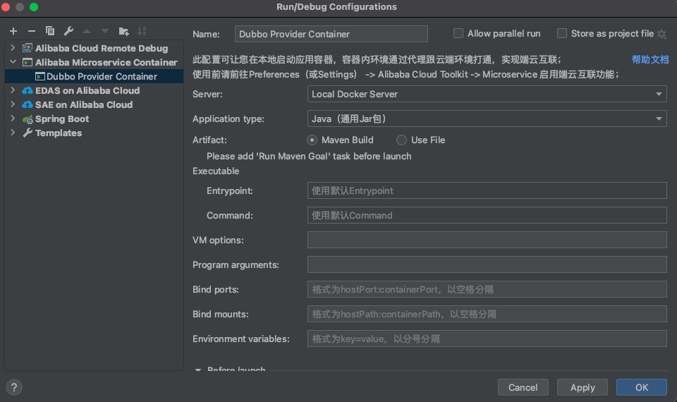 如果你是非Java语言用户,或者对应用运行环境有一定要求,那么可以使用3.0插件的容器级互联能力,来在本地使用Docker运行应用。在Docker容器中,应用可以正常访问云端服务和资源,流量自动通过代理来转发。