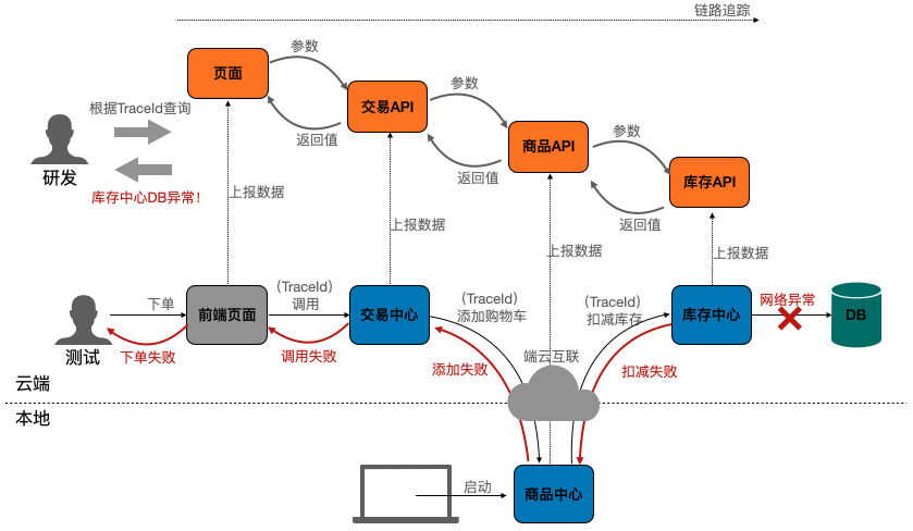 诸如此类的场景在开发过程中屡见不鲜,往往一个小问题要花费大量精力和时间来进行排查。这个场景是链路追踪技术的典型场景。现在,我们把链路追踪也集成到端云互联能力上,使得本地调用链路也能上报到云端,当出现异常时问题一目了然。