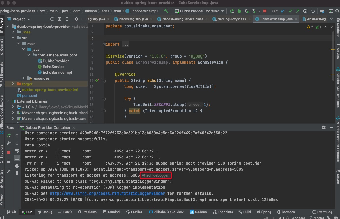 如果你在应用容器中运行的是Java语言应用,插件还支持快捷的应用调试,无需额外设置具体参数。启动应用时,插件会通过环境变量注入JDWP调试参数,以打开调试端口。插件进一步结合Intellij IDEA的智能检测,可通过Attach debugger来一键调试容器中的Java应用,如下所示: