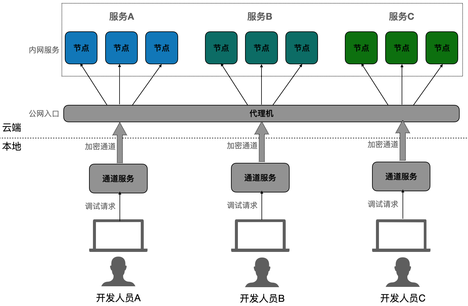 调试请求通过通道服务来转发给代理机,再由代理机转发至目标调试节点。通道服务和代理机之间的通道是加密的。对于安全要求非常严格的场景,可以使用安全组(或白名单)策略来进一步提高代理机的安全水位。