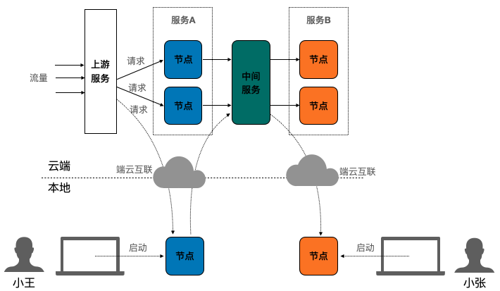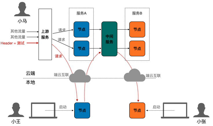 通过多人精准联调能力,可以使得只有小王发起的请求调到他的本地节点和小张的本地节点,而测试小马的请求只在云端稳定环境中调用。