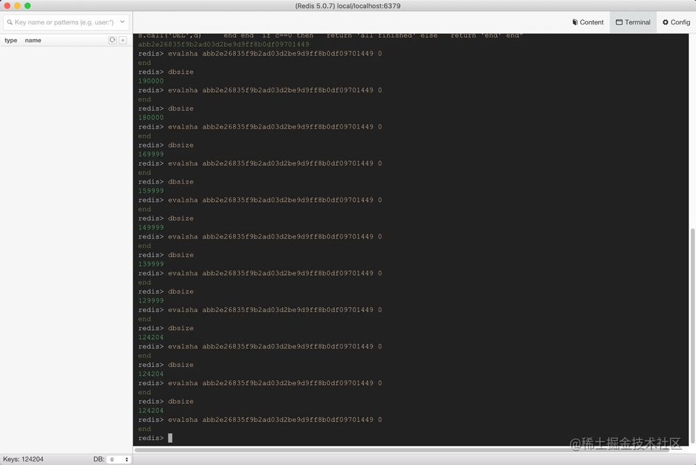 奇怪的是,前面几行都是正常的。但是到了第三次的时候,dbsize变成了16999,多删了1个,我也没太在意,但是最后在dbsize还剩下124204个的时候,数量就不动了。之后无论再执行多少遍,数量还依旧是124204个。