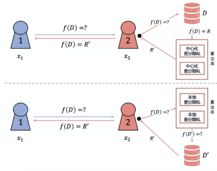 DP是一种基于对数据引入随机扰动,并从理论层面度量随机扰动所带来的隐私保护程度的隐私保护方法。根据随机扰动方式的不同,DP分为在原始数据层面进行随机扰动的本地差分隐私(Local Differential Privacy,LDP)和在计算结果层面进行随机扰动的中心差分隐私(Central Differential Privacy,CDP)。