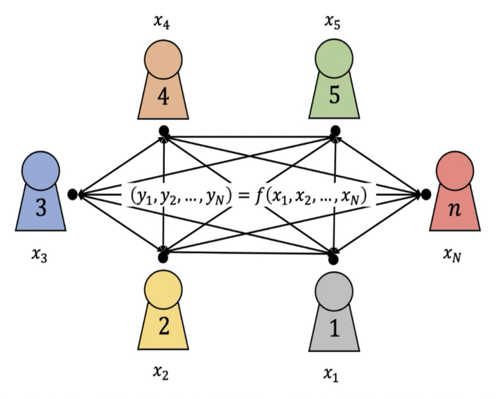 MPC是密码学中的定义,意为在无可信计算方的情况下,多个参与方各自持有秘密输入完成对某个函数的计算,但每个参与方最终只能得到计算结果和能从自己输入和计算结果中推出的信息,其他信息均可得到保护。