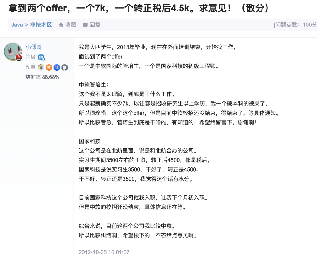 12年10月25日,在CSDN发的一个帖子 拿到两个offer,一个7k,一个转正税后4.5k。求意见!距离现在它已经过去好久了,当时也是因为拿到了两份offer的选择纠结,所以发了个帖子求问。好气的是当时竟然不知道去面试面试互联网公司,信息太闭塞了,而且培训的地方并没有说过互联网一些公司的信息。