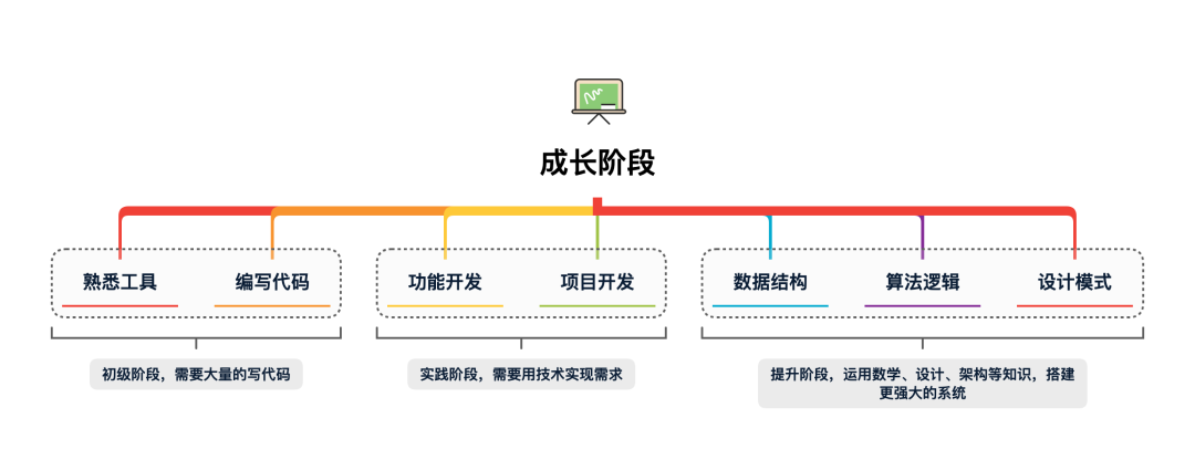 蓄力阶段的学习,主要是对编程技术的基础的夯实,以及多学习与数学相关的内容,比如;数据结构、算法逻辑,这些知识对将来在技术上的提升和造诣都是非常好的基石。下面就是整个大学过程中在编程学习过程中需要经历的阶段,如图;