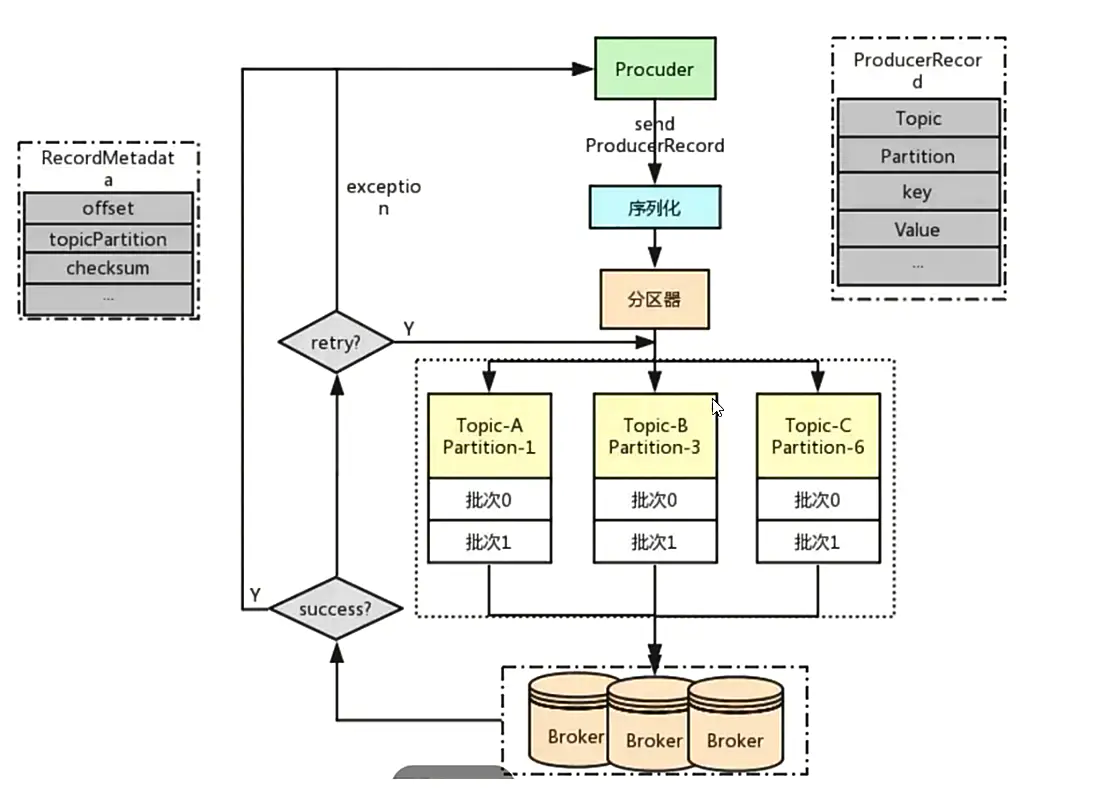 - 5)broker接收到消息后,如果成功会返回一个RecordMetadata,失败且不重试的话,则会返回一个异常。