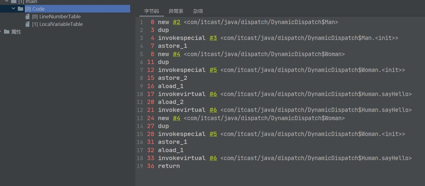 根据这个结论我们反向推理一下:man和women是静态类型相同的变量,它们在调用相同的方法sayHello()时返回了不同的结果,并且在变量man的两次调用中执行了不同的方法。导致这个现象的原因很明显,是这两个变量的实际类型不同,Java虚拟机是如何根据实际类型来分派方法执行版本的呢?我们看下字节码文件: