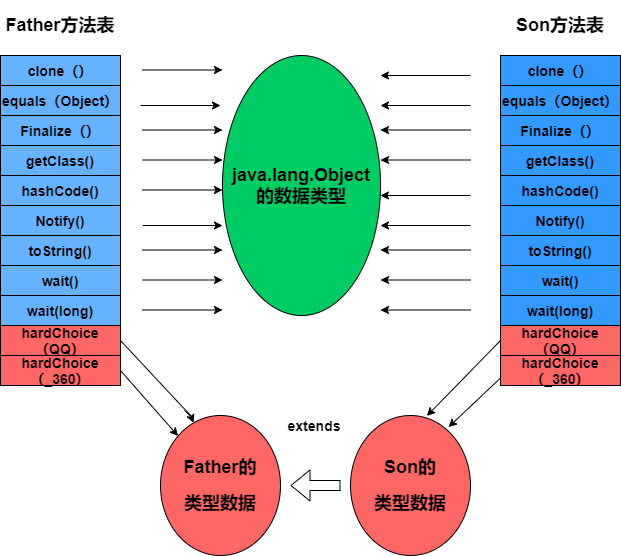 Son重写了来自Father的全部方法,因此Son的方法表没有指向Father类型数据的箭头。但是Son和Father都没有重写来自Object的方法,所以它们的方法表中所有从Object继承来的方法都指向了Object的数据类型。