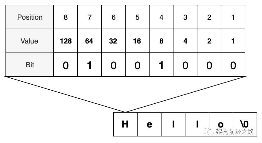 8比特等于一个字节,足以表示ASCII表中的任何字符。这些比特以特定的顺序翻转,以提供字符的十进制表示形式。计算机知道如何将这种表示形式转换为字母。