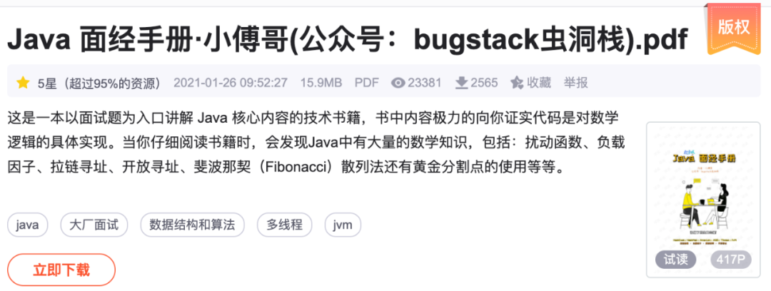 回复【面经手册】,下载《面经手册 • 拿大厂Offer》,这是一本有深度的Java核心内容,从数据结构、算法、并发编程以及JVM系8不断深入讲解,让懂了就是真的懂。