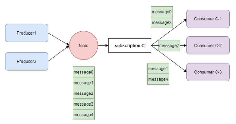 共享订阅(Shared):同一个topic可以由多个消费者订阅和消费。消息通过round robin轮询机制分发给不同的消费者,并且每个消息仅会被分发给一个消费者。当消费者断开,发送给它的没有被消费的消息还会被重新分发给其它存活的消费者。如下图: