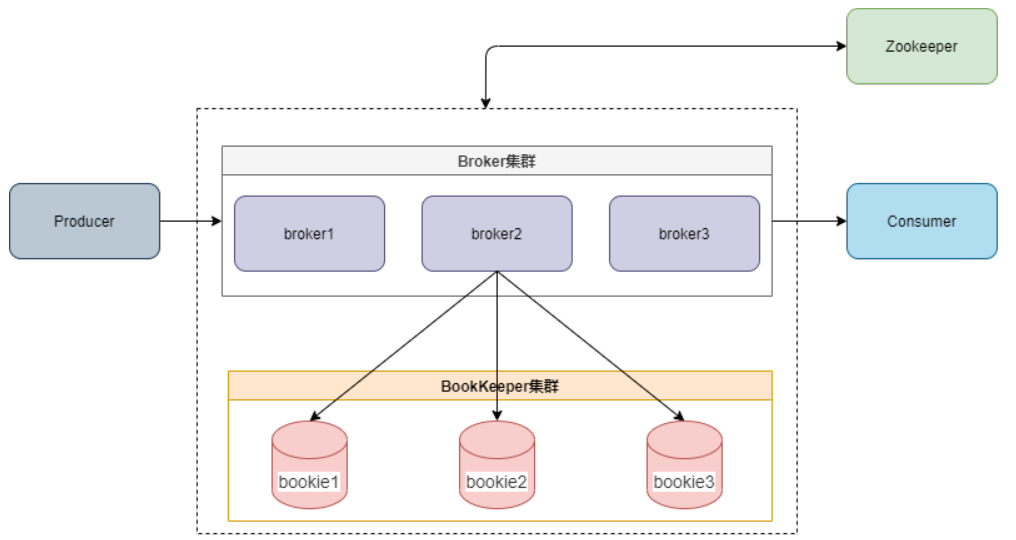 Pulsar采用分层架构,将计算和存储相分离,存储使用BookKeeper集群,计算使用Broker集群,Broker需要内置BookKeeper客户端。
