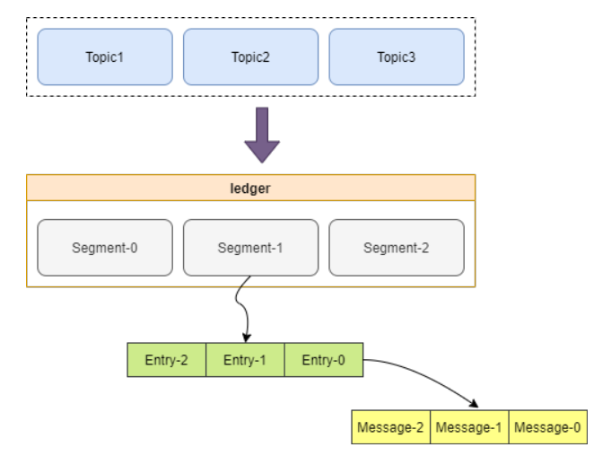 第一层是Topic,用来存储Producer追加的messages,Topic下面是ledger层,保存了分片(Segment),分片里面保存更小粒度的ertries,entries存储一条条的Message。