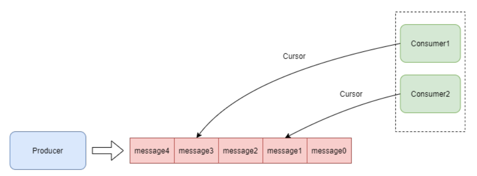 Consumer通过Subscription获取消息,同一Topic的Subscription可以获取到Topic数据的完整拷贝,这样Subscription为每一个Consumer分配一个Cursor,Consumer之间互不影响。如下图: