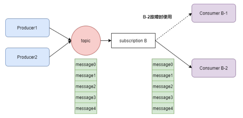 灾备模式(Failover):同一个topic可以有多个消费者订阅,但是只能有一个消费者消费,其他订阅的消费者作为故障转移的消费者,只有当前消费者出了故障才可以进行消费当前的topic。如下图: