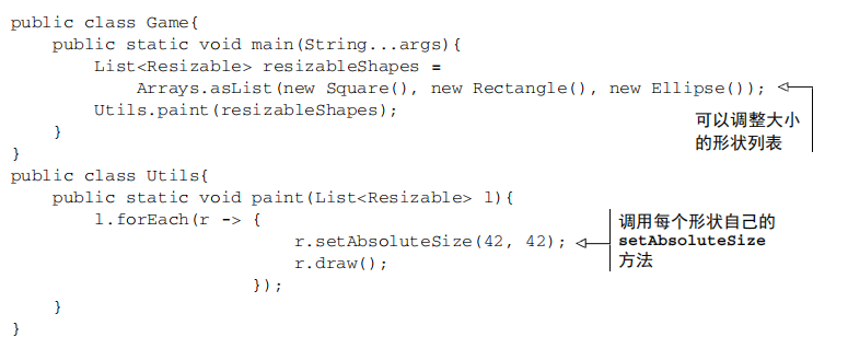 假如在一个绘图库中,存在一个接口Resizable,它定义了一个简单的可缩放形状必须支持的很多方法, 比如:setHeight、setWidth、getHeight、getWidth等。