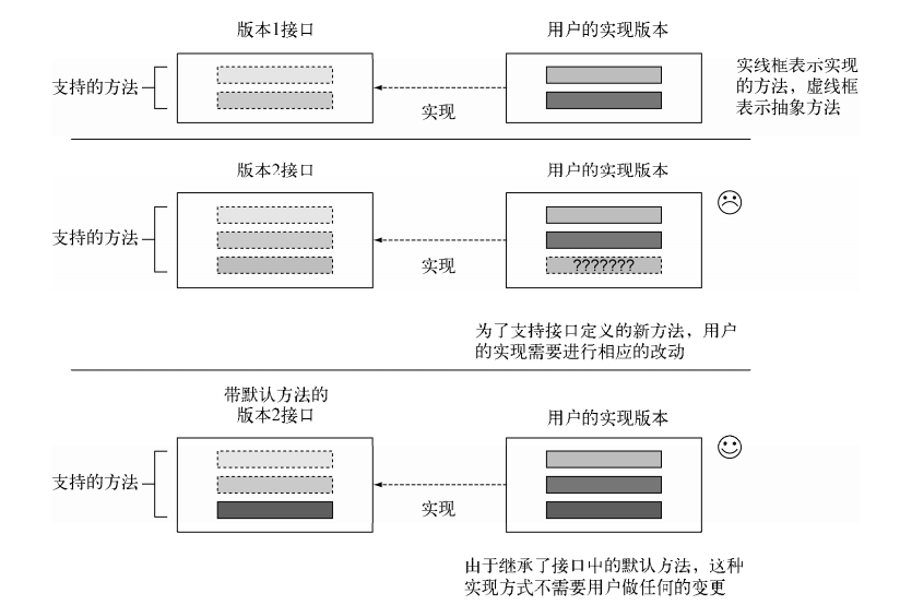 默认方法的引入就是为了以兼容的方式解决像 Java API这样的类库的演进问题的,如下图所示: