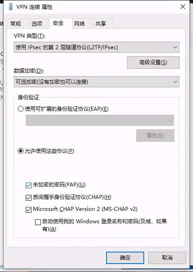 找到刚添加的vpn,右击属性,在“安全”选项中调整如下: