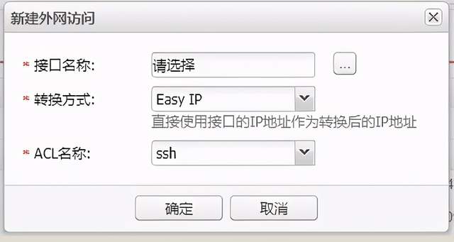 选择Easy IP,不需要自己过多配置,关联的ACL选择新添加的名为SSH的acl规则。