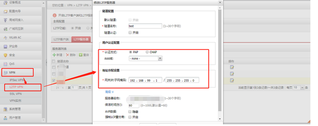 设置L2TPVPN服务端: