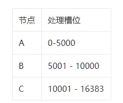 每个Redis节点负责处理一部分槽位,加入你有三个master节点 ABC,每个节点负责的槽位如下: