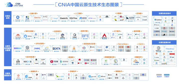 2020年7月,中国信通院发布了国内首个云原生技术生态图景,对国内云原生技术进行详细梳理,从云原生底层技术、云原生应用编排及管理、云原生应用、云原生安全技术、云原生监测分析共五大类、20个细化分类,详细展示国内云原生技术生态的全景视图,为国内云原生技术生态全貌提供了重要参考。