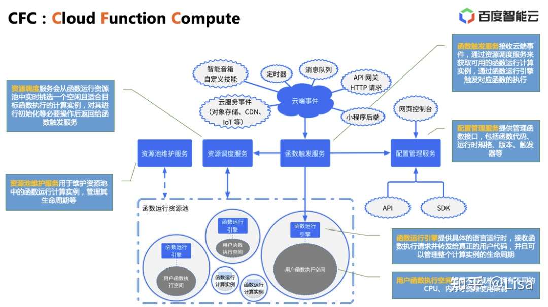 左侧是做资源的释放,资源池的维护会通过相应的服务模块架构对资源进行管控。资源的调度服务就是用来去响应事件触发服务,对整个资源池的管理。函数计算的核心就是基于事件的处理调度,将用户的代码和函数的核心功能进行动态的加载空间容器,并且进行动态销毁的过程。