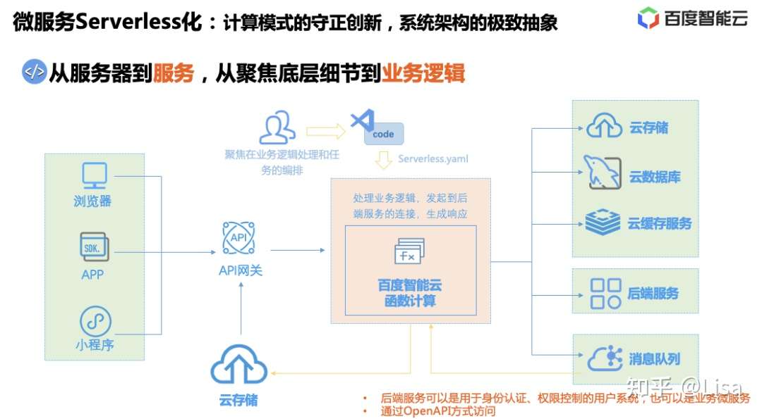 单体应用,或者微服务应用怎么迁入到 Serverless?对于一些场景,比如说小程序场景通过 API 网关的模式,然后调度到百度智能云函数计算处理业务,并且发起相应的业务逻辑去调度相应的后端服务,可以将部分的业务代码迁移到函数计算平台。将原来核心的部分业务逻辑代码仍然以微服务这样的方式放在后端服务里面。如果面对中小型企业客户,本来在云上产生了相应的存储和计算资源,可以继续使用云数据库云缓存的方式使用,百度云上的资源可以一站式打通。