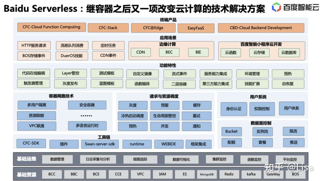 百度经过数年的打磨,在私有化和公有化领域里面,将开源和公有、私有,以及面向百度其他内部云支持的产品打磨成统一的公共的底层函数服务支持,这个能够满足整个函数计算的编写、上线、开发和运营,在大部分场景下能够提供相应的技术支持,并且百度还开发相应的工作链,提供了相应的 SDK 和插件,以及运行时能够供定制化的业务团队做二次开发。