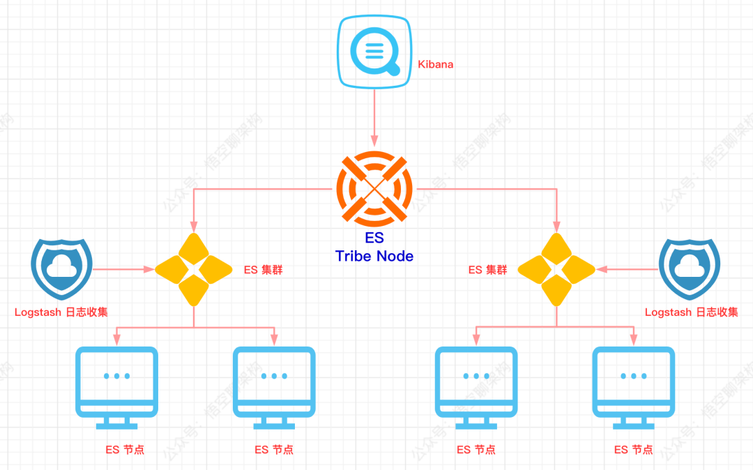 Kibana 负责客户端查询,将查询命令传送到 ES Tribe Node。 -