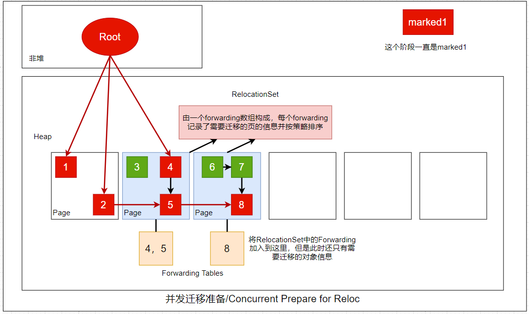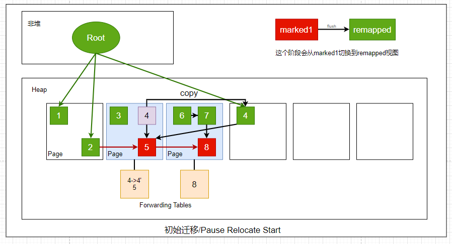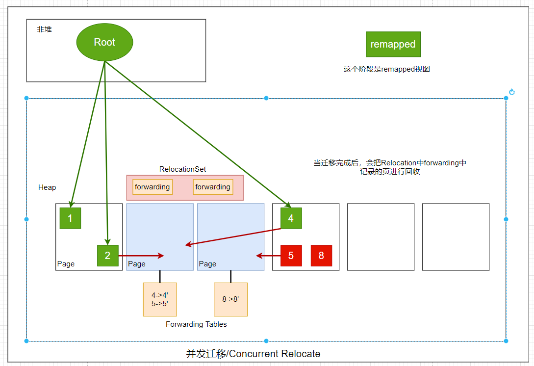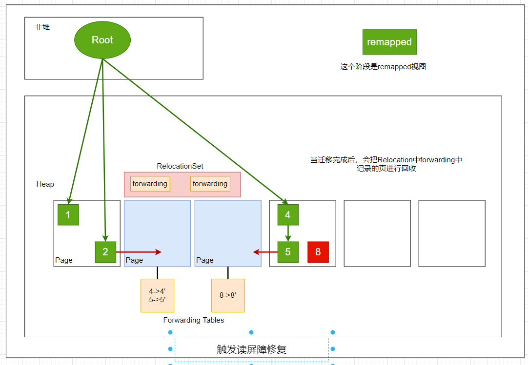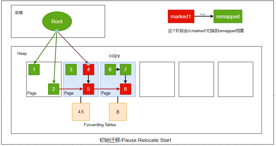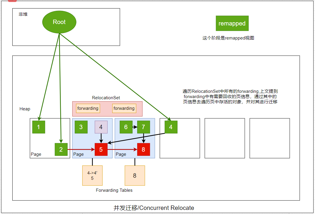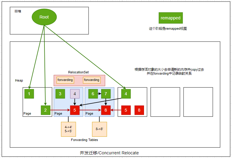 这个阶段会遍历gcRoot直接引用的对象指针,判断指针是好是坏,如果是好指针则染色并返回,这部分的方法和之前一样,笔者就没贴出来。如果是坏指针则会将其进行迁移,在空闲的页中申请一块内存将对象copy过去,然后在forwarding中插入映射关系。