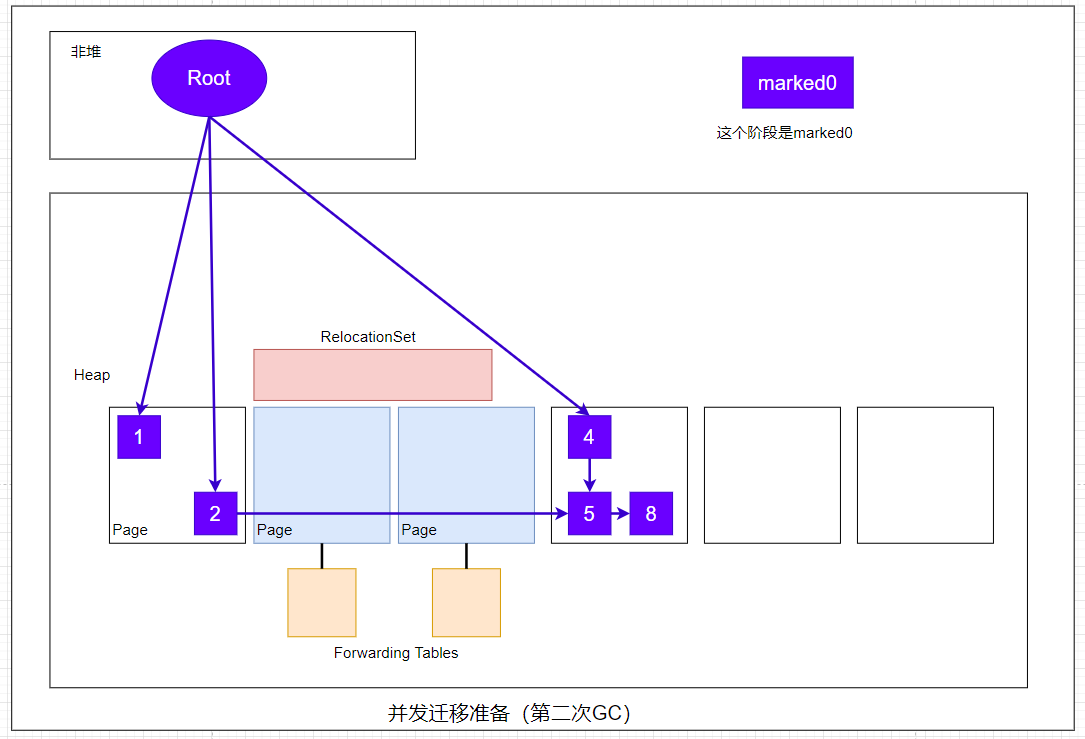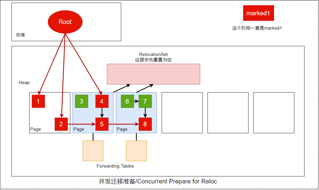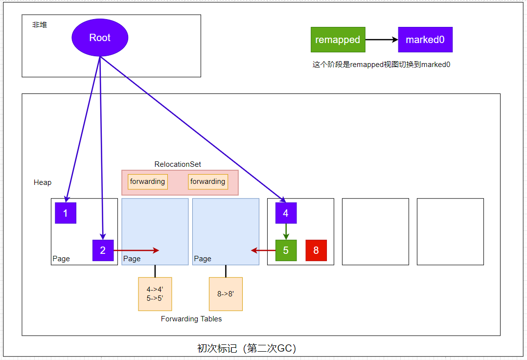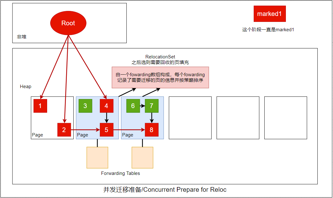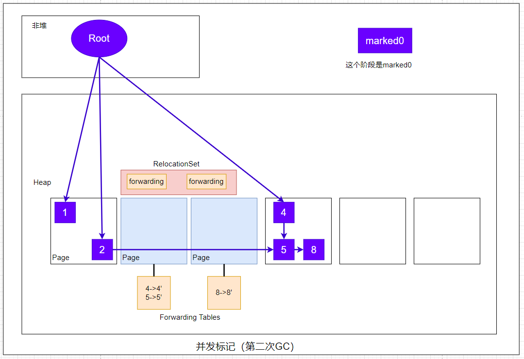 这个阶段会遍历gcRoot直接引用的对象指针,判断指针是好是坏,如果是好指针则染色并返回,这部分的方法和之前一样,笔者就没贴出来。如果是坏指针则会将其进行迁移,在空闲的页中申请一块内存将对象copy过去,然后在forwarding中插入映射关系。