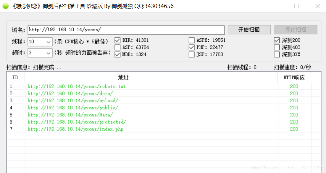 对于yxcms我也不熟悉,之前没接触过。拿到目标第一先用御剑扫描下后台吧