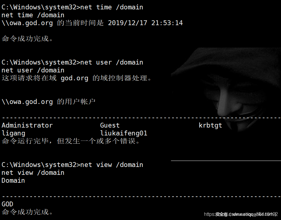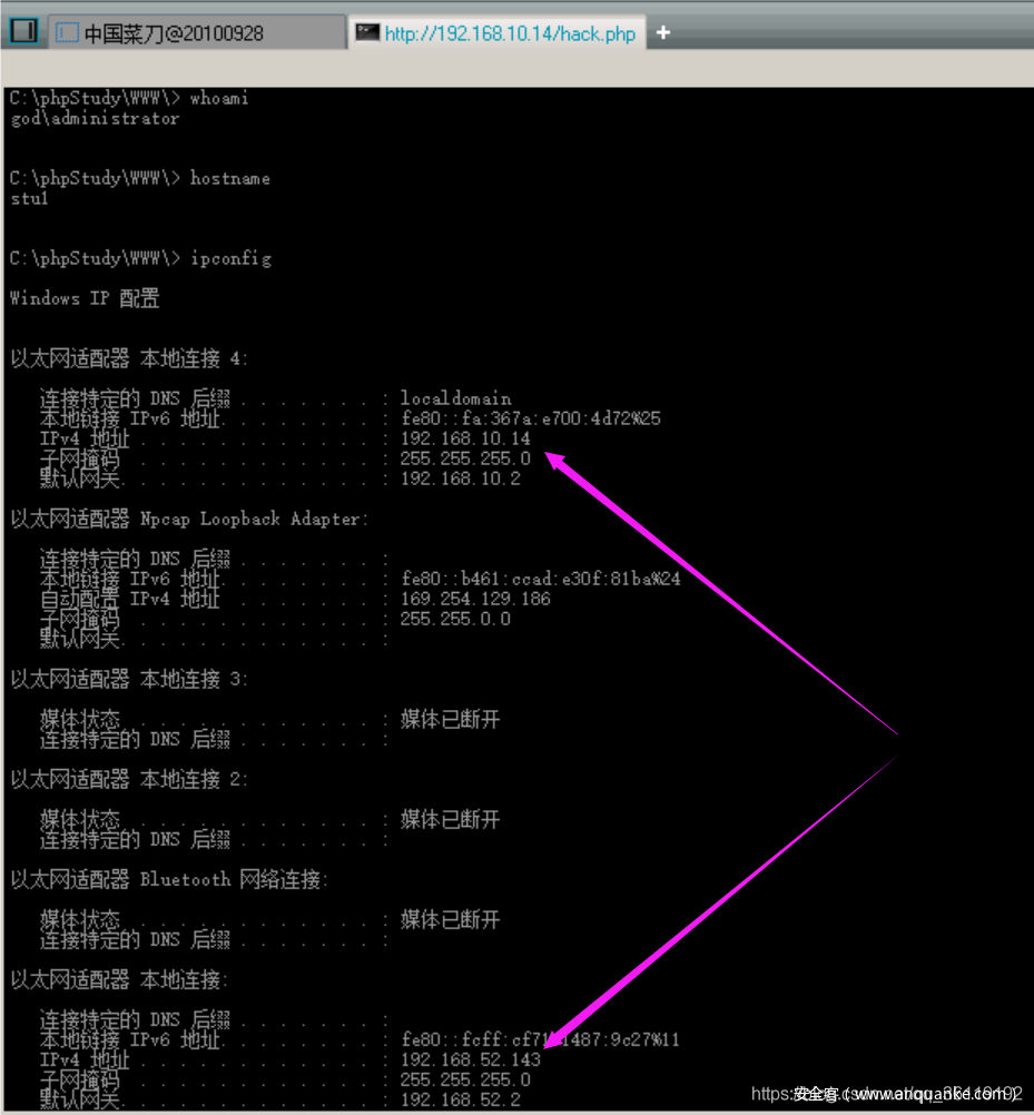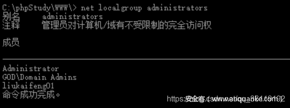 执行以下命令我们知道当前的用户身份是 administrator ,在管理员组中,并且处在域 god 中。该主机有两张网卡,分别是:192.168.10.14,192.168.52.143。由此可知,其实获得的这个权限就是域管理员权限。(搞不懂环境为啥要以域管理员账号登录,为啥不以本地普通用户登录??)